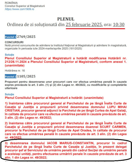 – în 25 februarie 2025, în jurul orei 10:30, procurorul PICCJ Marius Iacob este desemnat de Plenul CSM să activeze la structura de anchetare a magistraţilor;