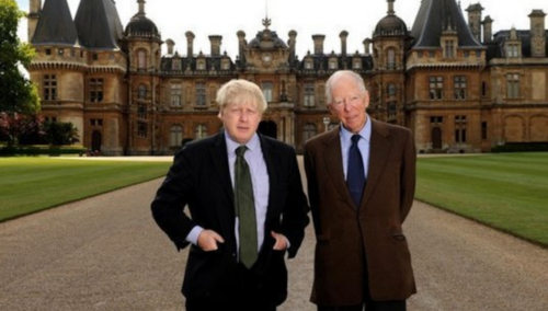 Boris Johnson et Lord Rothschild posent devant Waddesdon Manor lors du vernissage de l’exposition « Prédateurs et proies: une mosaïque romaine de Lod, Israël » au Waddesdon Manor (édifié par l’architecte Hippolyte Destailleur dans un style néorenaissance française pour le baron Ferdinand von Rothschild au XIXe siècle), le 5 juin 2014 à Aylesbury, en Angleterre.