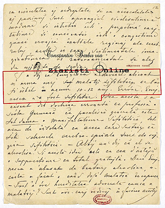 Știu cʼa venit fostul meu coleg de laborator și amic, Marinescu, ilustrul nostru nevrolog de azi, care după primul resentiment de revoltă sufletească față de maltratarea creerului lui Eminescu, îmi atrase atențiunea admirând conformațiunea extraordinară a circonvoluțiunilor lui voluminoase separate de șanțuri adânci, întocmai cum citează autorii de Anatomie despre creerii oamenilor geniali, cari au pus în coordinare directă lucrările lor neperitoare cu desvoltarea firească a creerilor lor.