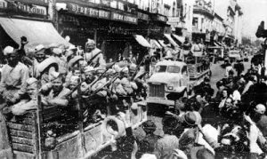 Strada Știrbei Vodă era încă plină de molozul lăsat în urmă de bombardamentul americanilor de la 4 aprilie. Printre trecătorii opriți să vadă defilarea învingătorilor se aflau și doi olteni. Terminaseră de vândut marfa din coșuri și priveau spectacolul sprijinindu-se în cobilițele ce păreau îndoite de greutatea lor. Zice unul dintre ei, vădit uimit: „Mă, ăștia i-au bătut pe nemți?!” „Nu, mă, îi răspunde celălalt oltean sigur pe el. Pe nemți i-a bătut Dumnezeu!”