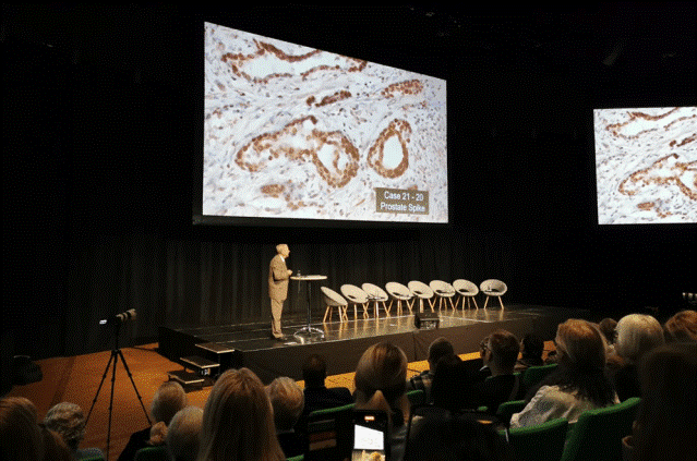 Un aspect care mi s-a părut foarte interesant la conferință a fost o prelegere ținută de profesorul Arne Burkhardt. Vă amintiți cum au promis că vaccinurile cu ARNm vor rămâne doar local în braț, iar oamenii au fost numiți teoreticieni ai conspirației pentru că au sugerat contrariul? Ei bine, se pare că acum se găsesc proteine spike în tot trupul, inclusiv în organele de reproducere, cum ar fi testiculele și ovarele.