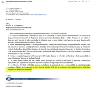 De asemenea, asociația a publicat, pe pagina de Telegram, răspunsul primit de la Ministerul Sănătății la o cerere de informații de interes public privind controversatul tratat pandemic.