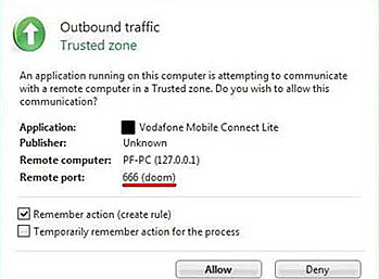Dacă se încearcă conectarea la internet prin modemurile Vodafone, apare un straniu port 666. Unii utilizatori au semnalat şi plasat pe Internet captura de ecran ca probă că la încercarea de conectare a unui modem Vodafone la calculator avertismentul firewall-ul ESET marca portul cu nr. 666, cu notificarea între paranteze (doom), cuvânt ce înseamnă „osândă” (666).