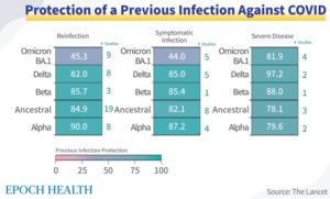 În contextul în care există tot mai multe dovezi că vaccinurile au avut efecte drastic mai slabe în timpul răspândirii Omicron, o meta-analiză recentă, care cuprinde zeci de studii, dezvăluie că imunitatea naturală oferă o protecție mai bună împotriva reinfectării, infecțiilor simptomatice și a formelor severe ale tuturor variantelor covid-19 decât toate vaccinurile anti-covid. În plus, imunitatea naturală oferă avantajul de a reduce revenirea infecției virale în comparație cu vaccinarea completă, arată meta-analiza amplă, prezentată de Epoch Times.