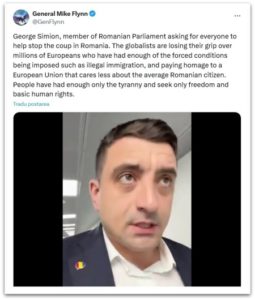 „George Simion, deputat în Parlamentul României, cere ajutorul tuturor pentru a opri lovitura de stat din România. Globaliștii își pierd controlul asupra milioanelor de europeni care s-au săturat de condițiile forțate impuse, cum ar fi imigrația ilegală și omagierea unei Uniuni Europene căreia îi pasă mai puțin de cetățeanul român obișnuit. Oamenii s-au săturat doar de tiranie și caută doar libertatea și drepturile fundamentale ale omului”, a scris pe X fostul consilier al lui Trump.