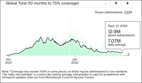 Pe o perioadă de doi ani, au fost administrate peste 12,9 miliarde de doze de vaccin în 184 de țări (Bloomberg, 21 septembrie 2022, vezi graficul de mai jos).