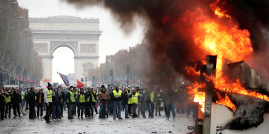 On ouvre une parenthèse pour signaler qu’une journaliste commentait le « A dans son cercle » de l’anarchie, tagué sur l’Arc de Triomphe, en disait qu’il était la signature des « antifas ». Parfait ! Tout va bien, car ce sont donc des amis politiques des médias du système, puisqu’ils sont censés lutter contre le fascisme casqué, armé, botté, militarisé – celui de Marine Le Pen bien sûr ! Or, pour l’heure, s’il est bien des gens armés, casqués, bottés, militarisés, ils semblent bien plutôt se trouver chez ces prétendus antifascistes que du côté des gilets-jaunes dont il est facile de revêtir le vêtement pour commettre des forfaits, d’autant plus que le pouvoir et les médias de l’État maastrichtien n’attendent que cela pour stigmatiser le mouvement.
