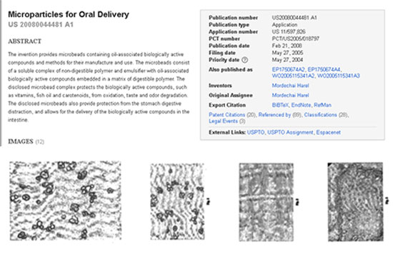 Aplicaţia nr. US20080044481A1 din 27 mai 2005 pentru un brevet în SUA se referă la „microparticule pentru eliberarea de substanţe administrate pe cale orală”.