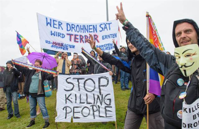 Mii de protestatari au format un lanţ uman la o bază aeriană americană, în vestul Germaniei, în semn de protest faţă de atacurile cu avioane fără pilot, relatează The Associated Press.