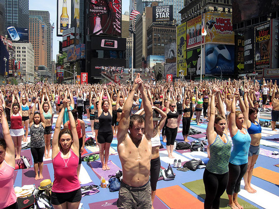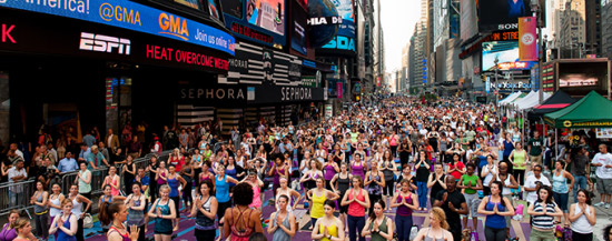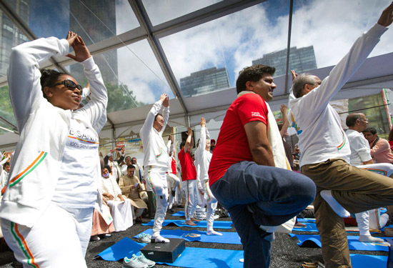 De cealaltă parte a globului, în Statele Unite ale Americii, la New York, mii de oameni au executat posturi yoga la unison în Times Square. Pe lângă alţi politicieni şi diplomaţi, la manifestare a participat şi secretarul general al Organizaţiei Naţiunilor Unite, Ban Ki-moon.