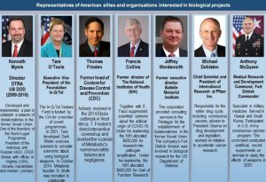 Printre aceștia se numără fostul director al DITRA, Kenneth Myers, vicepreședintele executiv al fondului de capital de risc In-Q-Tel controlat de CIA, Tara O’Toole, fostul șef al Centrului pentru Controlul și Prevenirea Bolilor din SUA, Thomas Frieden, fostul director al National Institutes of Health, Francis Collins, fostul director executiv al Battelle Memorial Institute, Jeffrey Wadsworth, cercetător șef și președinte al departamentului internațional de cercetare, dezvoltare și medicină al Pfizer și mulți alții.