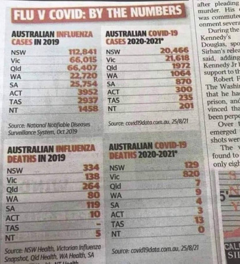 În imaginea de mai jos, extrasă dintr-o publicație australiană tipărită, sunt puse în paralel datele oficiale referitoare la numărul de cazuri de gripă și de covid-19, respectiv numărul de decese provocate de aceste boli, care au fost înregistrate în perioada 2019 – 25 august 2021.