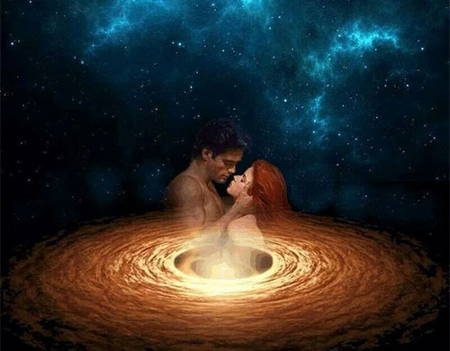 D’ailleurs, nous rencontrons également un grand nombre d’autres localisations et homologations des principes métaphysiques et cosmologiques à l’intérieur du corps humain. C’est ainsi que le côté droit du corps est masculin, et le côté gauche féminin, par imitation du ÇIVA, sous sa forme androgyne, bi-sexuelle, ARDHANARIÇVARA. Pour le tantrisme VISHNOUITE, RADHA, la bergère légendaire de VRIN-DAVAN, amoureuse du dieu KRISHNA, correspond au côté gauche de l’homme et KRISHNA au côté droit. L’homme parfait, en suivant de près KRISHNA, son modèle divin, est androgyne. Mais dans le KALI-YUGA, l’androgynie humaine, qui équivaut à la perfection et à la béatitude, ne peut plus être obtenue uniquement par des techniques méditatives et contemplatives. Il faut, pour y parvenir, une expérience concrète, de structure sexuelle, seule capable d’éveiller ces deux principes polaires endormis dans le corps humain et, par conséquent, de réaliser l’union de KRISHNA et de RADHA, de ÇIVA et de ÇAKTI, d’UPAYA et de PRAJNA.