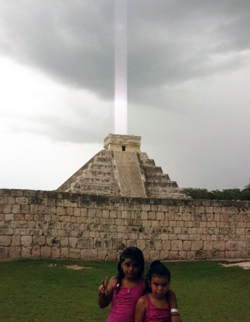 În jurul orei 14:00, tatăl le-a făcut fetiţelor trei fotografii în faţa piramidei Kukulcan cu camera digitală a telefonului celular. Când s-a uitat imediat după aceea la imagini a fost surprins să constate că celularul înregistrase în ultima poză o rază de energie luminoasă destul de mare şi clară care ieşea din vârful piramidei.