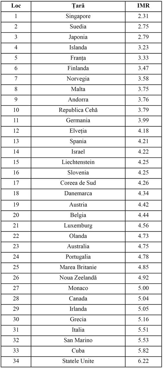 Puteţi observa în tabelul nr.1 rata mortalităţii infantile pentru 34 de ţări, pentru anul 2009, valorile fiind date în ordine crescătoare. În fruntea listei sunt țările cu cele mai puține decese infantile.