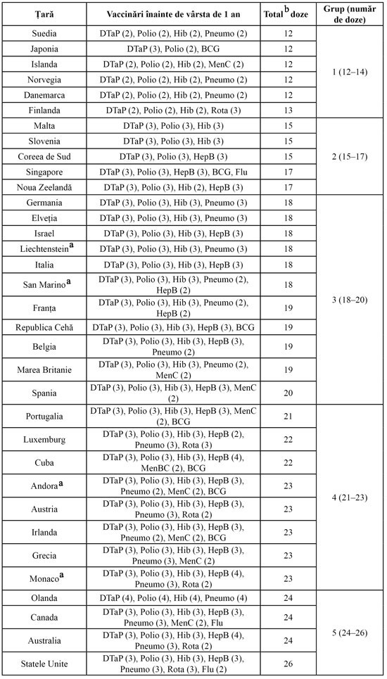 În tabelul nr.2 sunt redate numărul și tipul de vaccinuri (imunizări) care sunt făcute în primul an de viață în 34 de țări.