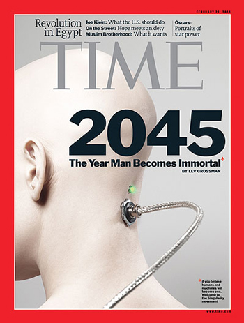 Copertă a revistei TIME ce anunță pompos că anul 2045 este anul în care ființa umană devine nemuritoare. Ilustrația evidențiază în mod semnificativ ce înseamnă de fapt nemurirea și omul nemuritor pentru transumaniști: o ființă pe jumătate om, pe jumătate robot, dispensabilă și controlabilă, care poate trăi mai mult, dar a cărei conștiință este subjugată din umbră prin intermediul calculatorului de către niște stăpâni care nu pot fi decât capii așa-zis iluminați ai francmasoneriei mondiale, ce au finanţat dezvoltarea acestei tehnologii diabolice.