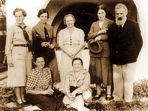 Constantin Brâncuşi, alături de membre din Liga Naţională a Femeilor Gorjene, acasă la Arethia Tătărescu (centru), în 1937, la Târgu-Jiu