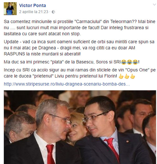 Ponta a făcut referire la sticlele de vin „Opus One” pe care președintele PSD, Liviu Dragnea, le oferea cadou fostului director adjunct al SRI, Florian Coldea. Importanța acestui gest stă în primul rând în semnificația ofrandei de vin „Opus One”, pe care Dragnea i-o oferea șefului operativ al SRI. Ea marchează aderarea, voalată, la oculta mondială. Ca dovadă, redăm un citat din lucrarea lui Walter Brewitz, Familia Rothschild (ediție cu studii anexă a editurii CarpathiaRex) unde se vede cine și în ce condiții produce acest vin: