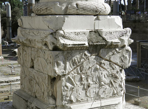 Peste drum de Altare della Patria, opulentul monument închinat de romani regelui unificator, Vittorio Emanuele, într-o piaţetă elegantă, înconjurată de pini zvelţi, se află faimoasa Columnă a lui Traian. Departe de vâltoarea turistică, înconjurată doar de lume bună, cunoscătoare, Columna are o nobleţe aparte, care izvorăşte tocmai din încleştarea nemaivăzută pe care o mărturisesc basoreliefurile sale. Toată drama războiului daco-roman e acolo. O epopee dăltuită în piatră, ca să spună peste veacuri povestea a două popoare mândre şi încăpăţânate. Jos, pe baza columnei, e steagul sfânt al dacilor, capul de lup cu trup de şarpe, sunt toate armurile şi armele de luptă, atât de exotice pentru lumea romană. E lupta de la Tapae acolo, din primul război, e construcţia podului lui Apolodor, sunt scenele din al doilea război, cu femei dace luptând alături de bărbaţii lor…