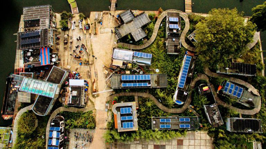 Aproape un secol de industrie grea din zonă este șters cu buretele și transformat într-un experiment verde. Nu lipsesc nici panourile solare care sunt instalate pe toate bărcile-birou și care asigură cam 65% din nevoia de electricitate a spațiului care și-a crescut consumul de energie după deschiderea cafenelei De Ceuvel, principala atracție a hipsterilor.