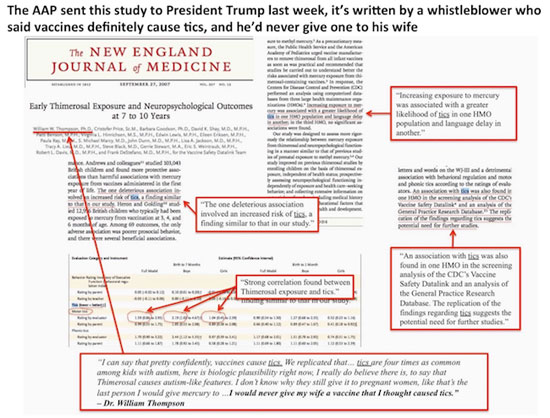 Oddly, they sent the President several papers authored by a Whistleblower scientist at CDC who has confessed to throwing away data implicating the MMR vaccine in autism, a wanted felon, and a paper that clearly explained that vaccines were causing neurological tics (that’s not ‘safe’).