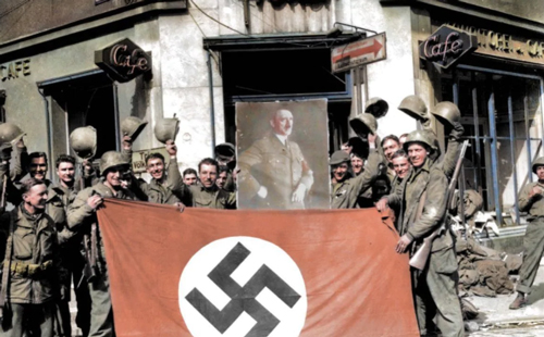 Soldați americani cu portretul lui Hitler și steagul nazist