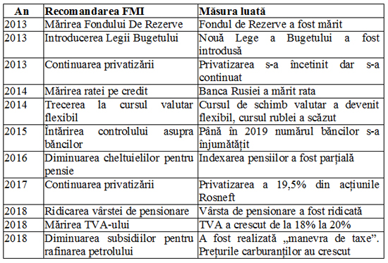 Unele recomandări ale Comisiei FMI pentru Rusia și măsurile luate în acord cu ele