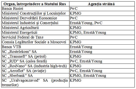 Organele și întreprinderile statului rus care au recurs la serviciile agențiilor străine de consulting