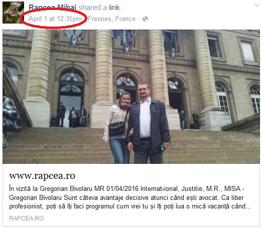 Aşa putem constata şi în postarea de pe 1 aprilie de pe blogul său, în care dincolo de o „glumă de 1 aprilie”, caută să sădească insidios şi plin de răutate îndoiala, dispreţul și descurajarea faţă de activităţile MISA şi ale lui Gregorian Bivolaru. În articolul său, Rapcea aduce pe un ton aparent firesc detalii despre cum ar fi ajuns el de curând într-un „City Break” la Paris. El susţine că acolo s-a dus să îl vadă la închisoare pe Gregorian Bivolaru şi că a fost cuprins de milă faţă de modul cum ar fi arătat acesta. Bineînţeles, Rapcea nu a fost acolo, dar a urmărit să scrie cât mai credibil, pentru a înşela cititorii şi pentru a introduce astfel, într-un mod viclean şi batjocoritor, idei şi concluzii negative.