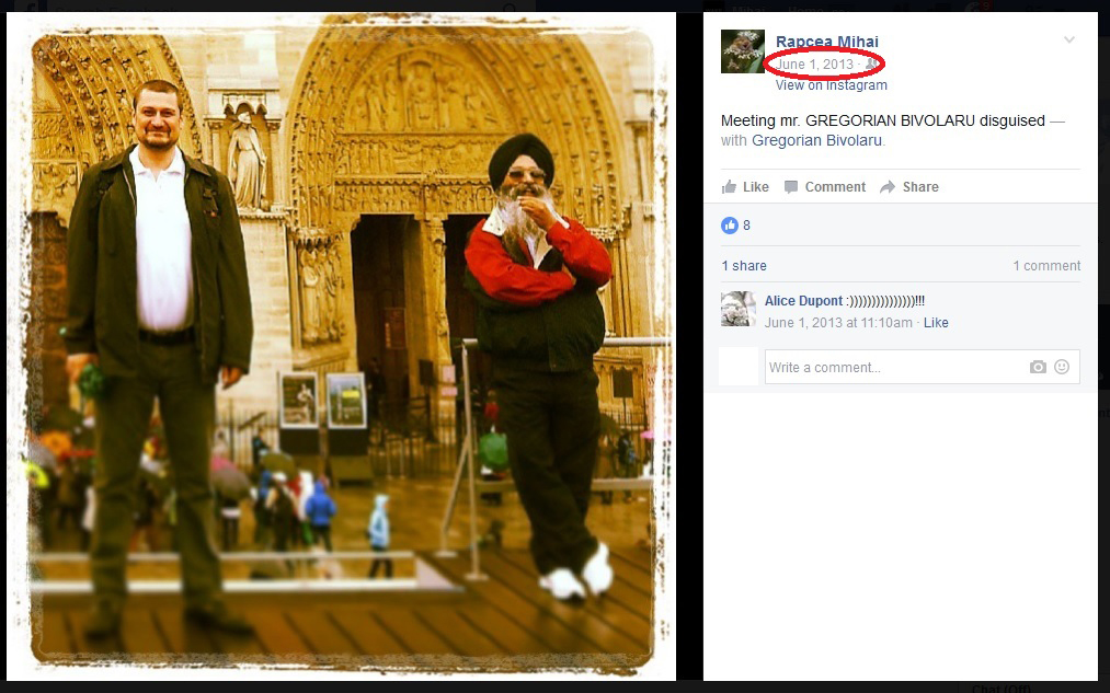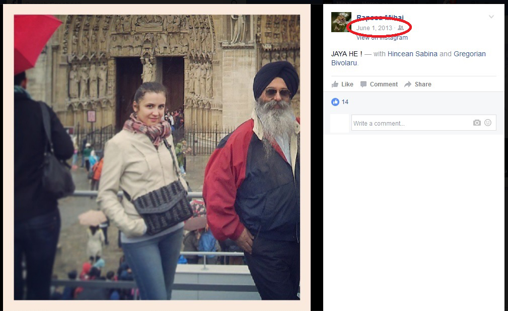 Putem observa că Rapcea folosește în articol imagini dintr-o călătorie la Paris din anul 2013, pe care nu le făcuse încă publice. În fotografiile respective se vede că atât el cât și prietena lui au exact aceeași vestimentație în pozele datate 2013 cu cele pe care Rapcea pretinde că le-ar fi făcut în 2016. Observăm de asemenea și obsesia sa pentru Gregorian Bivolaru, despre care spunea în mod fantasmagoric și în 2013 că l-ar fi întâlnit … „deghizat”. Se pare că prezența lui Gregorian Bivolaru îl urmărește pretutindeni, îl „vede” peste tot.