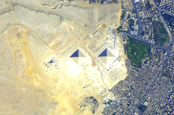 The towers appear to be artificial and laid out in the same pattern as the famous Giza pyramids of Egypt.