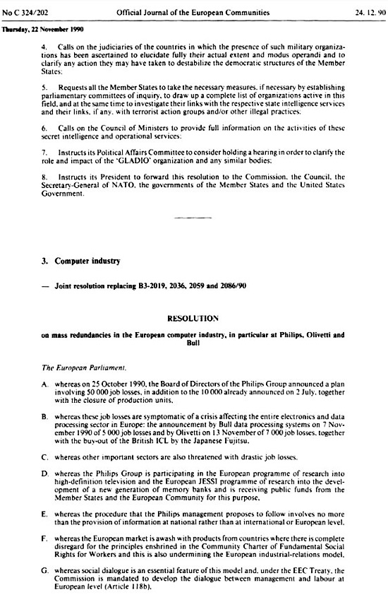 Această rezoluţie din 1990 a Parlamentului European este un act excepţional, pentru că e prima dată în istorie când un organism oficial internaţional recunoaşte că terorismul este creat şi întreţinut de serviciile secrete. Rezoluţia Parlamentului European arată clar că „serviciile militare secrete (sau ramuri necontrolate ale acestora) au fost implicate în cazuri grave de terorism și crimă organizată” şi că „anumite forţe militare ale SUA și NATO să fi încurajat crearea în Europa a unei rețele clandestine de informații și operaţiuni“. Ceea ce documentul oficial european vrea să spună este aceea că CIA şi NATO au creat structuri clandestine militare, care au susţinut activităţi de terorism pe teritoriul Europei.