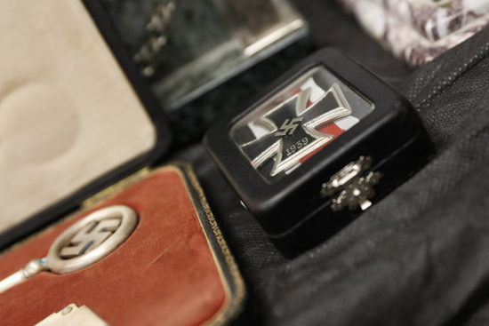 Detail of artifacts bearing Nazi symbols that were recovered by the Argentine Federal Police (PFA), displayed during an event at the headquarters of the Delegation of Argentinean Israeli Associations (DAIA) in Buenos Aires, Argentina, on June 19, 2017.