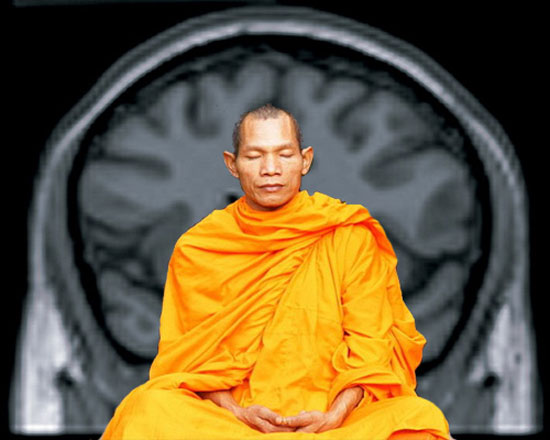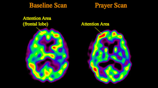 În partea stângă a imaginii – scanare de referință, în partea dreaptă – scanare în timpul rugăciunii. Se evidențiază activarea intensă în timpul rugăciunii a ariei atenției din lobul frontal.