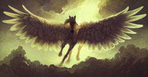 – Pegas: În mitologia greacă, Pegas[17] este un cal divin cu aripi, născut din sângele Gorgonei Meduza după ce aceasta a fost ucisă de eroul Perseu. Este asociat cu zeul Poseidon și servește ca vehicul pentru eroi precum Bellerophon.