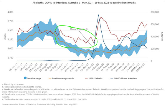 Cu toate acestea, grupul de experți HART (Health Advisory and Recovery Team) a indicat Australia ca fiind un „grup de control” în această privință. HART notează că, deși Australia nu a trecut printr-un scenariu covid foarte grav (doar 30.000 de infecții raportate și 910 decese) înainte de jumătatea anului 2021, a observat totuși o tendință a mortalității în exces, mortalitate non-covid începând cu iunie 2021 (a se vedea mai jos). HART notează că Australia „nu a avut cazuri de covid anterior care să justifice această creștere a mortalității și a presiunii spitalicești din primăvara anului 2021”. În schimb, „rezultatele din acest grup de control indică faptul că motivul acestei creșteri a numărului de decese, în special la tineri, este necesar să aibă ceva în comun în Australia, Europa și SUA.”