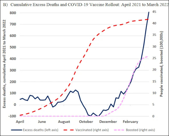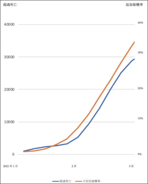 În Japonia, Guy Gin raportează că profesorul Seiji Kojima de la Universitatea Nagoya a găsit aceeași corelație în timpul lansării rapelului în perioada ianuarie-martie 2022 (a se vedea mai jos) – o perioadă în care majoritatea deceselor în exces nu au fost provocate de covid. Concluziile studiului au fost: „Creșterea excesului de mortalitate în ultimele patru luni a fost înregistrată la toate vârstele, cu excepția grupei 0-29 de ani, care nu este în mare parte eligibilă pentru rapel.”