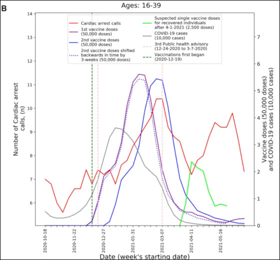 În Israel, un studiu publicat în revista Nature a observat o tendință similară pentru persoanele cu vârste cuprinse între 16 și 39 de ani, apelurile de urgență pentru stop cardiac crescând și scăzând odată cu prima și a doua doză și apoi crescând și scăzând din nou după doza booster.