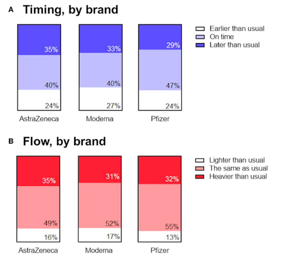 Într-un studiu amplu prospectiv de cohortă realizat de Harvard, studiul Apple Women’s Health, durata ciclului a fost urmărită de 9.682 de femei vaccinate și nevaccinate, dintre care majoritatea au fost vaccinate (88%) cu Pfizer (55%) sau Moderna (37%).