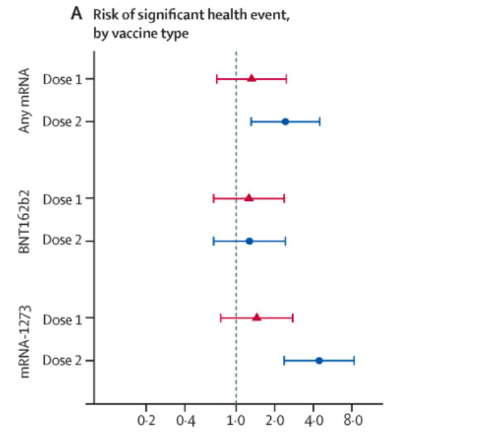 Femelele însărcinate vaccinate au prezentat un risc de 4,4 ori mai mare (95% CI 2,4-8,3) de apariție a unui eveniment sever de sănătate după doza a doua de vaccin Moderna, comparativ cu femeile însărcinate nevaccinate.