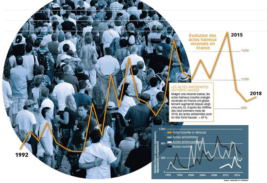 Malgré une récente baisse, les actes haineux (courbe orange) recensés en France ont globalement augmenté depuis vingt-cinq ans. Et, d’après les chiffres des neuf premiers mois de 2018, les actes antisémites sont en très forte hausse : + 69 %.