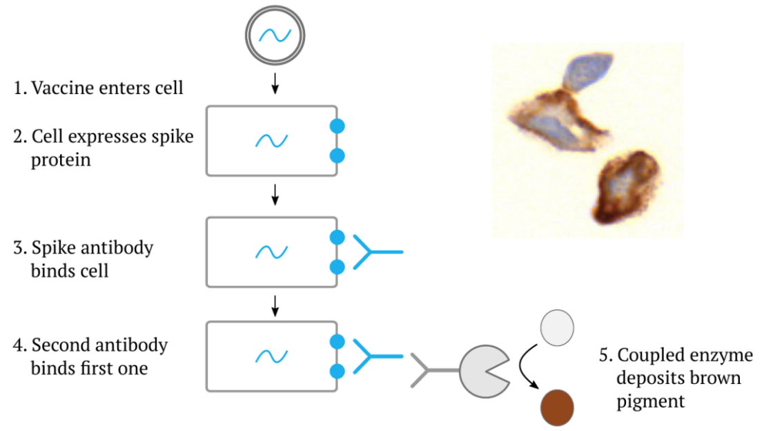 „În dreapta sus a imaginii, puteți vedea două celule care au fost expuse la vaccinul Pfizer și apoi supuse protocolului prezentat mai sus. Pata maro intensă indică faptul că celulele au produs proteina Spike”, se arată în studiu, referindu-se la imaginea 3.