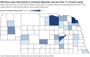 Gates deține în prezent aproximativ 20.000 de acri de terenuri agricole în 19 comitate din Nebraska, după ce a vândut unele terenuri în ultimii ani. El deține cea mai mare parte a terenului, aproximativ 8.500 de acri, în Holt County.