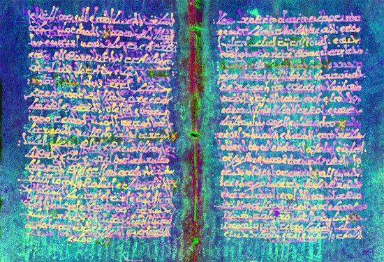 Oamenii de știință și-au dat seama de mult că pe vechiul pergament s-a aflat, anterior, un alt text. Vreme de un deceniu ei s-au străduit să îl „citească” sub slovele scrise mai recent, în secolul XI. Au fost utilizate razele infraroșii, precum și radiația UV, în încercările (eșuate) de deslușire a textului vechi. Acest lucru nu l-au reușit decât cercetătorii de la SLAC, folosindu-se de razele X.
