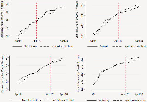 Un studiu german a pretins că introducerea obligativității măștilor în orașele germane a condus la o scădere a infectărilor. Însă datele nu sprijină această concluzie: în unele orașe nu a fost nicio modificare, în altele a fost o descreștere, în altele numărul de cazuri s-a mărit (vezi graficele de mai jos). Orașul Jena, prezentat drept model, a introdus în același timp cele mai dure măsuri de carantină din Germania, însă studiul nu a menționat acest aspect.