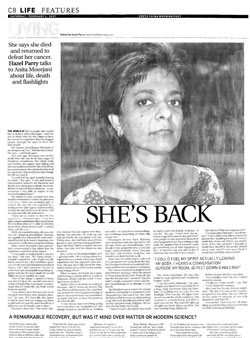Anita Moorjani atribuie însănătoşirea şi recuperarea ei rapidă unei schimbări profunde în mintea şi inima ei. Experienţa acesteia este una dintre cele mai renumite experienţe la pragul dintre viaţă şi moarte (near-death experience/ NDE).