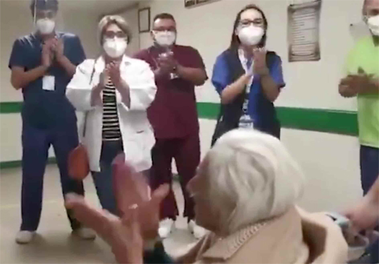 În imaginile date publicității de IMSS se poate vedea cum medicii o aplaudă când părăsește spitalul într-un scaun cu rotile.