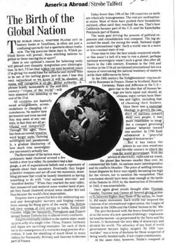 20 iulie 1992 – Revista Time publică articolul „Naşterea naţiunii globale”, de Strobe Talbott, bursier Rhodes, coleg de cameră cu Bill Clinton la Universitatea Oxford, director al Consiliului pentru Relaţii Externe (CFR) precum şi membru al Comisiei Trilaterale, secretar de stat adjunct al preşedintelui Clinton. În articol, el scrie: „Ideea de naţiune aşa cum o înțelegem noi astăzi va fi depășită; toate statele vor recunoaşte o singură autoritate globală… Toate ţările sunt de fapt aranjamente sociale… Nu contează cât de permanente sau sacre ar părea la un moment dat, ele sunt toate artificiale şi temporare… Poate că suveranitatea naţională nu a fost o idee chiar aşa de bună… Dar evenimentele din secolul nostru minunat şi teribil au făcut să câștige ideea înființării unui guvernul mondial.”