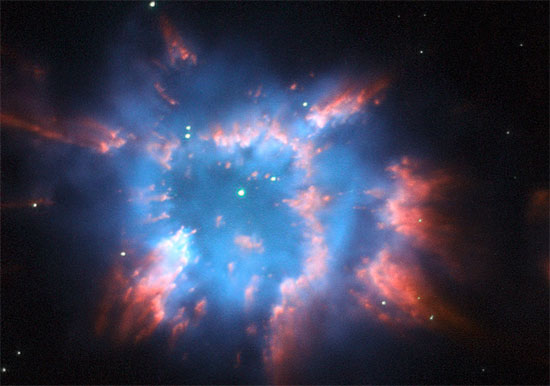Această imagine a fost creată din imagini captate de Wide Field Planetary Camera 2 a telescopului spaţial Hubble. Culorile vii albastre şi roşii provin din materiale care includ oxigenul ionizat şi hidrogenul, care strălucesc sub acţiunea radiaţiei ultraviolete aprinse de la steaua centrală, care încă mai este caldă.
